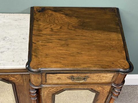VICTORIAN WALNUT CREDENZA, with inverted front, marble top, and three mirrored doors, 92 (h) x 151 (w) x 40cms (d)