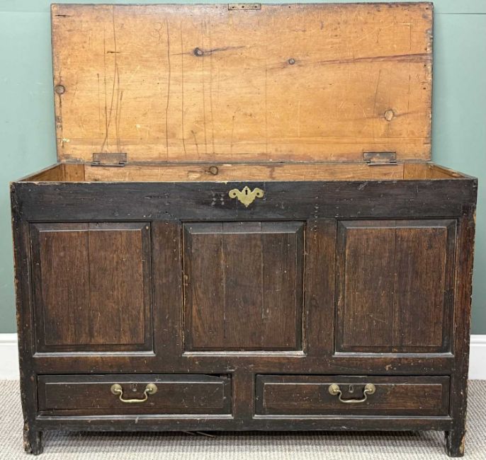 VINTAGE STAINED PINE MULE CHEST, with three fielded panels over two base drawers, 77 (h) x 119 (w) x 50cms (d)