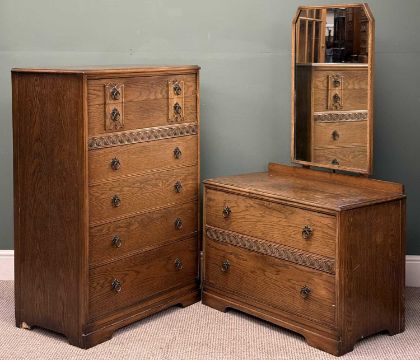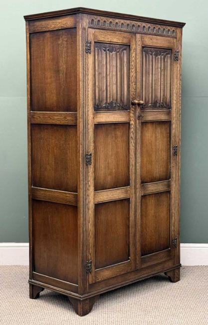 OAK LINEN FOLD TWO-DOOR WARDROBE, by Jaycee, 168 (h) x 94 (w) x 47cms (d); similar era chest of drawers, 116 (h) x 77 (w) x 46cms (d); and a two-door dressing table, 145 (h) x 85 (w) x 46cms (d) (3)