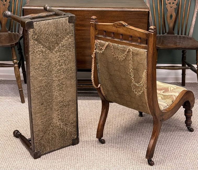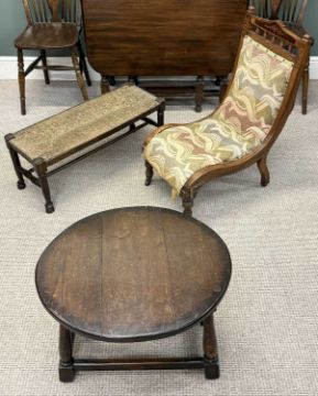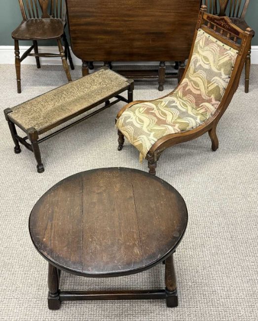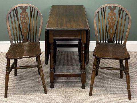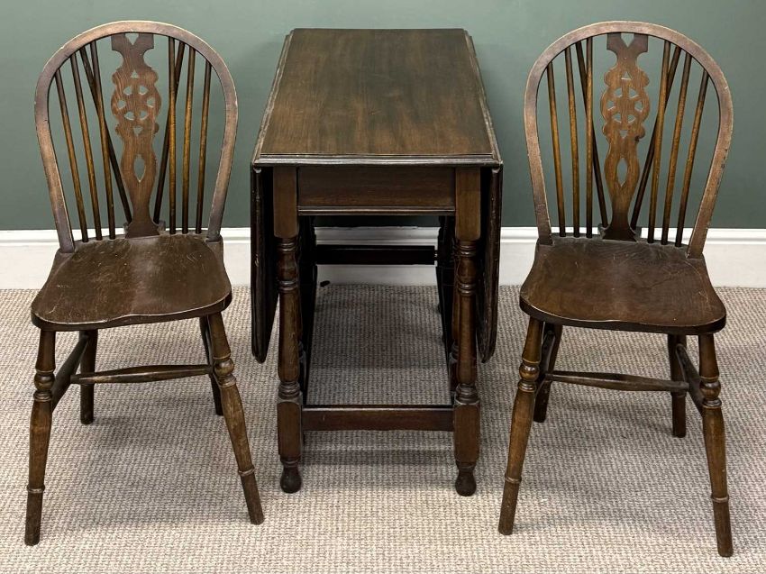 FURNITURE ASSORTMENT, including mahogany gateleg dining table, 73 (h) x 46/131 (w) x 89cms (d); two hooped wheel and spindle-back dining chairs; side table, etc. (6)