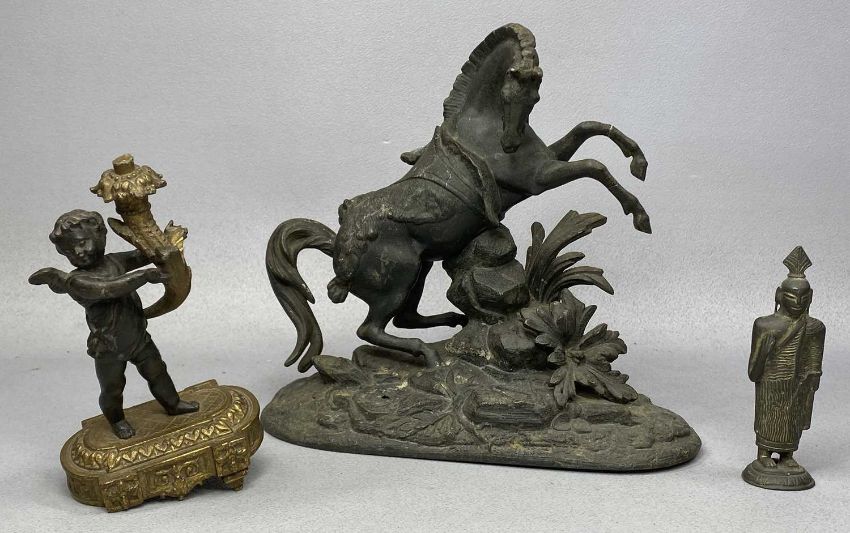 ASSORTED METALWARE, including pewter teapot, vintage paintbox, pair of cherubs on plinth, etc.