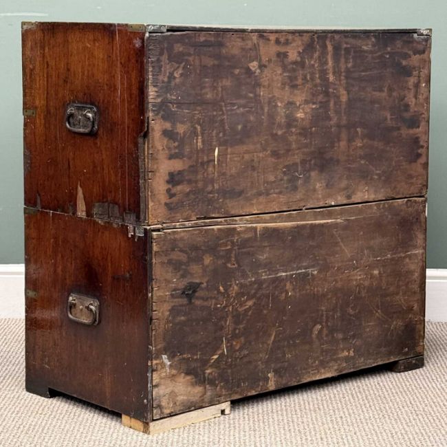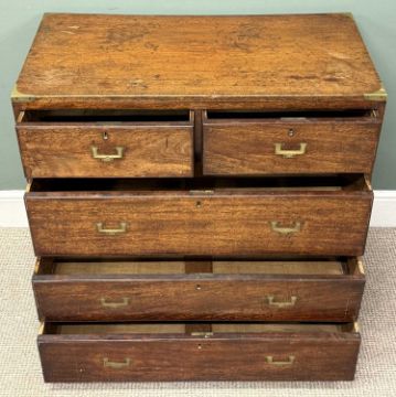 VICTORIAN TEAK CAMPAIGN CHEST, having recessed brass corners and handles, iron side carry handles, in two sections, two short and three long drawers, 88 (h) x 92 (w) x 47cms (d)
