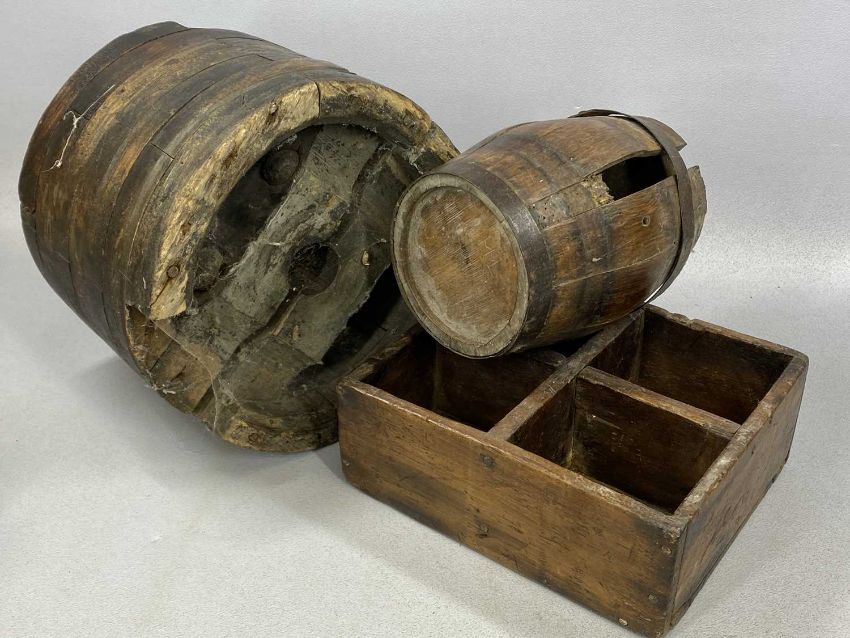 TREEN ITEMS including six-compartment coin tray, cider barrel, four-compartment box, etc.