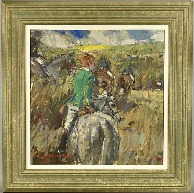 20TH CENTURY BRITISH SCHOOL oil on canvas - entitled 'All in Green Went My Love Riding', monogrammed 'P.M.' and dated '99 lower right, 40 x 39.5cms