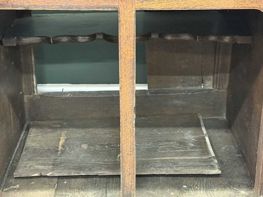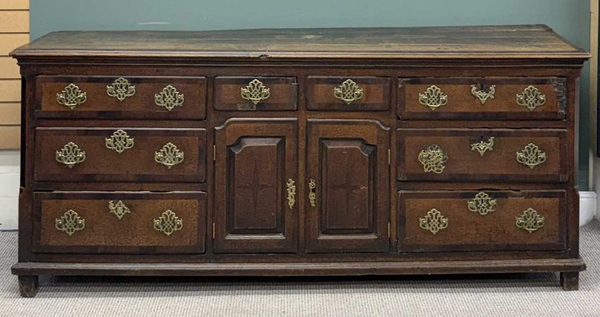 18TH CENTURY OAK DRESSER BASE, possibly English-Welsh borders, multiple drawers with brass drop handles and twin cupboard central doors, 91 (h) x 215 (w) x 61cms (d)