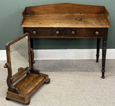 VICTORIAN MAHOGANY WASHSTAND, having raised back and sides, two frieze drawers with turned knob handles, on turned supports, 87 (h) x 106 (w) x 49cms (d); and a Victorian mahogany toilet mirror having rectangular plate and drawer to base, 64 (h) x 54 (w) x 27cms (d)