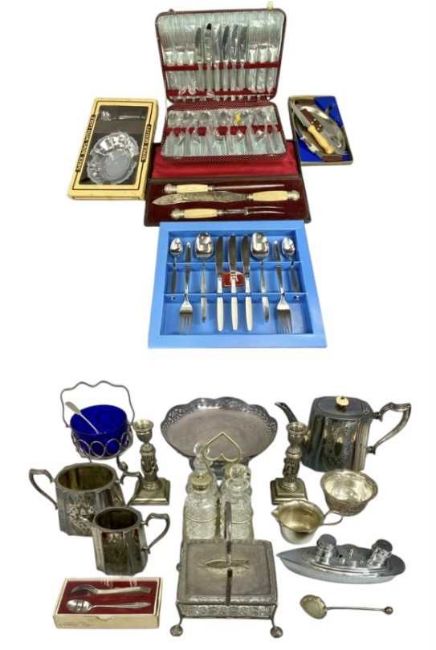 ASSORTED PLATED ITEMS, including three-piece tea service, pair of candlesticks, various cased cutlery, etc.