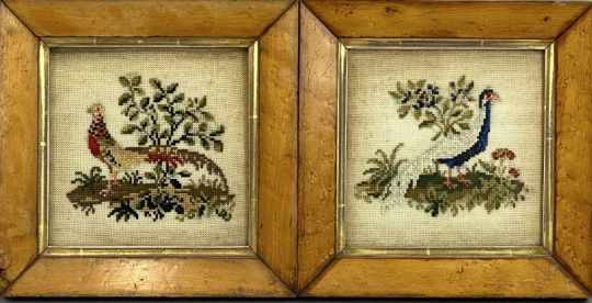 TWO VICTORIAN WOOLWORK PICTURES depicting pheasants, 29.5cms², in period maple frames