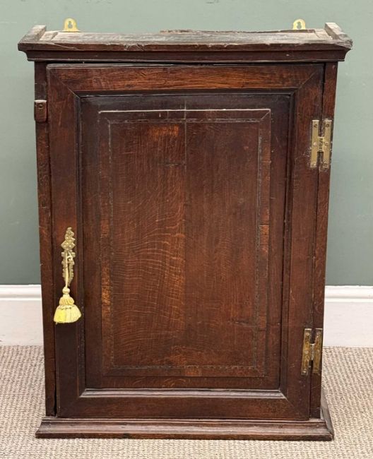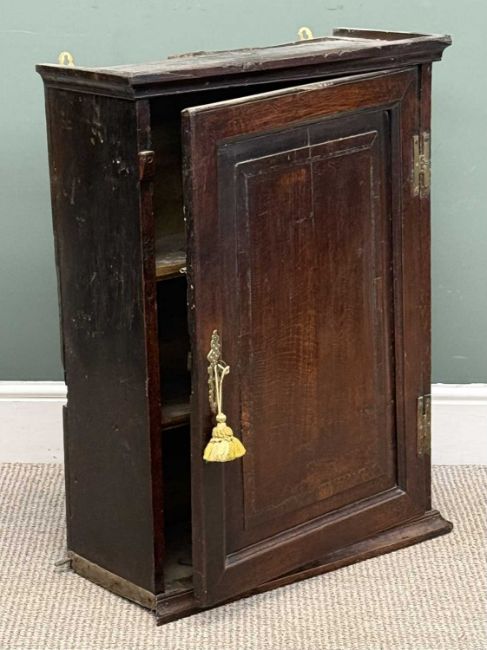 ANTIQUE OAK OBLONG WALL HANGING SINGLE-DOOR CUPBOARD, 87 (h) x 64 (w) x 29cms (d)