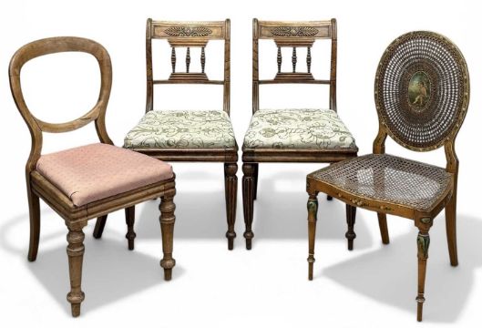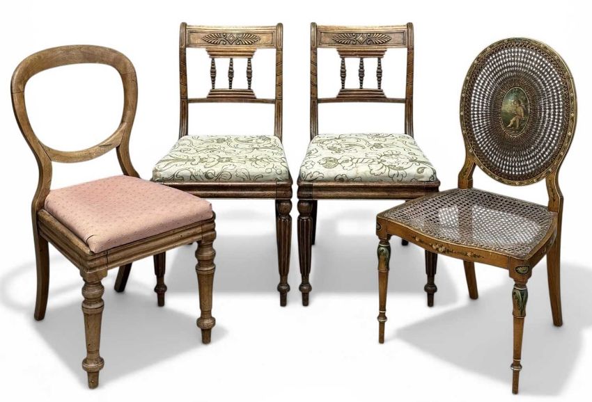 FOUR VARIOUS DINING CHAIRS, including an elegant Sheraton style satinwood bedroom chair with painted putti medallion, 90 (h) x 48 (w) x 44cms seat (d); two late 19th century mahogany dining chairs with carved and spindle backs; and a balloon-back type chair