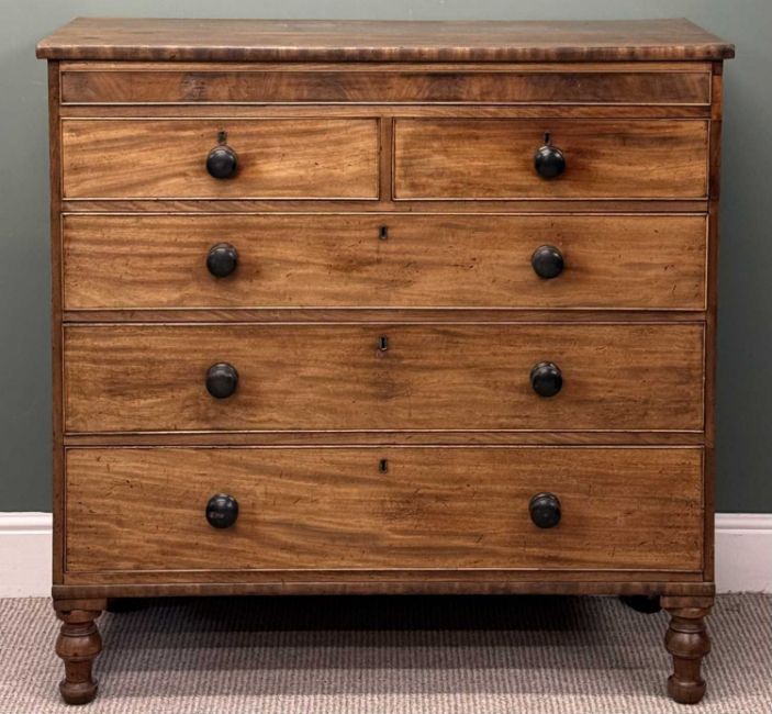 LARGE VICTORIAN MAHOGANY CHEST of two over three long drawers, turned knobs and feet, 112 (h) x 115 (w) x 54cms (d)