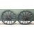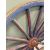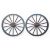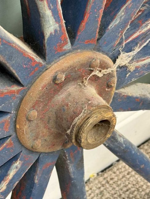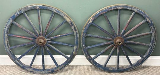 PAIR OF PAINTED WAGON WHEELS for garden use, 94cms (diam.)