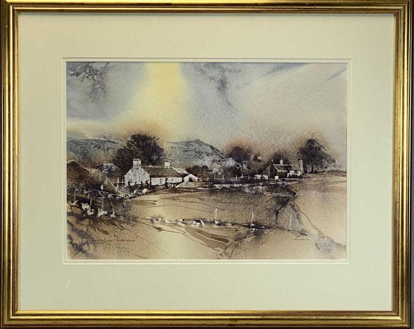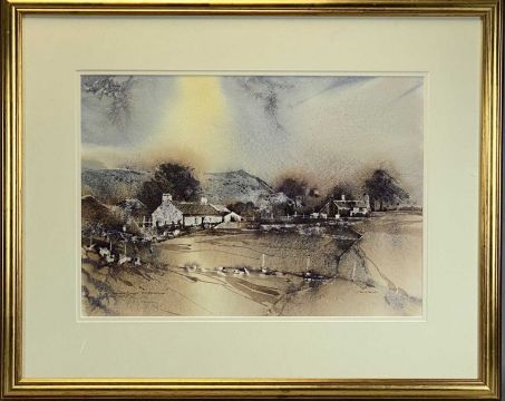 JOHN MORRIS (Welsh b.1922) watercolour - landscape with cottages, signed lower right, indistinctly titled lower left, 34.5 x 49cms
