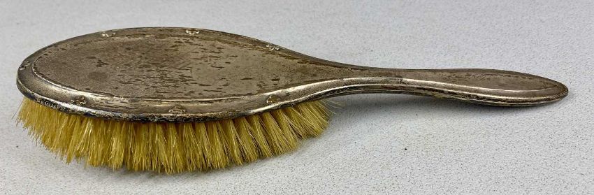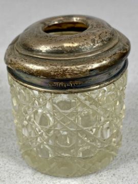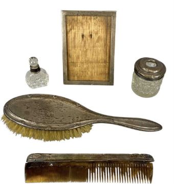 SILVER-MOUNTED COLLECTABLES, including rectangular photograph frame, 13.5 x 10cms, hairbrush and comb, cut glass scent bottle, and cut glass dressing table jar