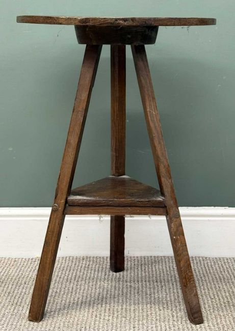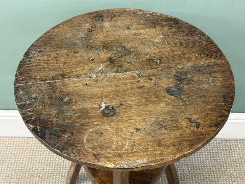 CHARACTERFUL OAK CIRCULAR-TOPPED CRICKET TABLE, with lower shelf, 19th century, 74 (h) x 49cms (diam.)