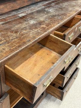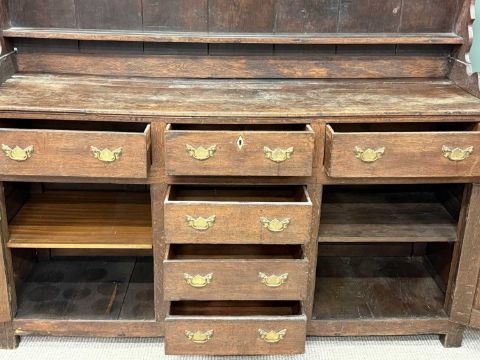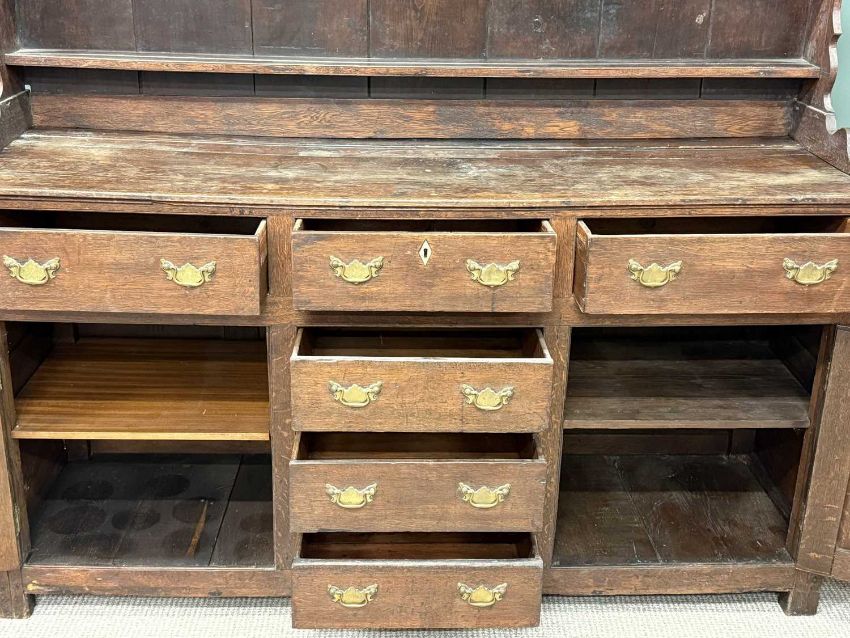 LATE 18TH CENTURY OAK WELSH DRESSER, three-shelf shaped rack above base with T-arrangement of six opening drawers and two cupboard doors, brass drop handles, 195 (h) x 168 (w) x 46cms (d)