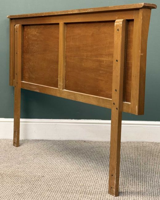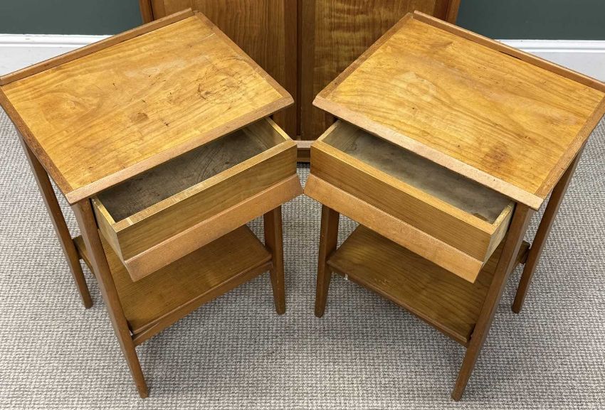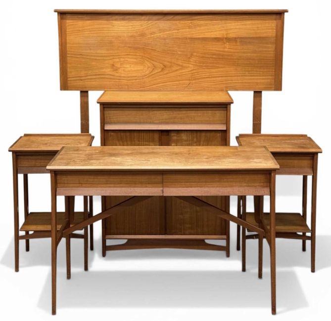 HEALS MID-CENTURY LIGHT WOOD BEDROOM FURNITURE, to include rail-back valet cupboard with single drawer (no label), 97 (h) x 79 (w) x 47cms (d); dressing table with twin drawer (labelled), 74 (h) x 110 (w) x 47cms (d); two bedside tables (no labels), 73 (h) x 44 (w) x 35cms (d); and a headboard (no label), 94 (h) x 145 (w) x 85cms (d) (5)