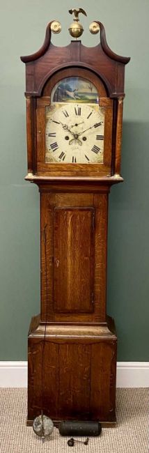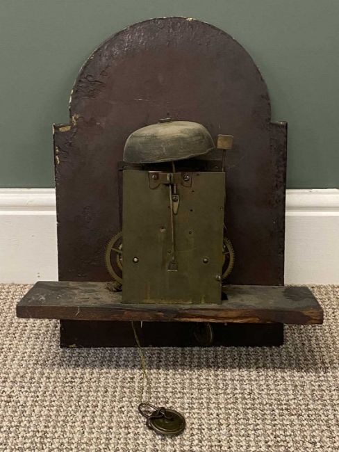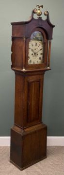 19TH CENTURY OAK LONGCASE CLOCK, painted dial with subsidiary seconds dial and date arch, single weight and pendulum, 209 (h) x 49 (w) x 26cms (d)