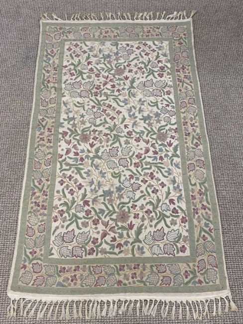 CREWEL WORK RUG in cream ground, with purple, blue and green foliate decoration, 150 x 90cms