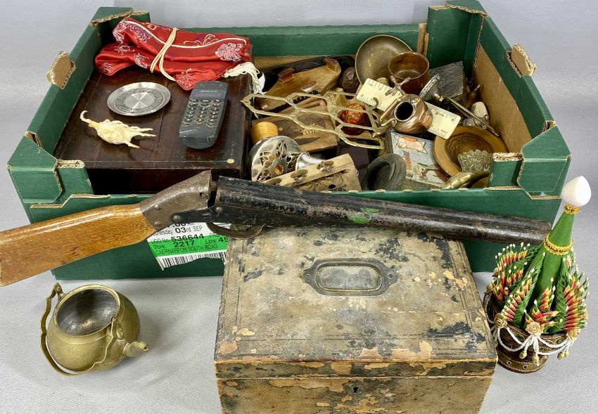 ASSORTED COLLECTABLES, including rosewood trinket box, leather trinket box, child's pop gun, etc.