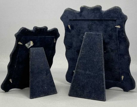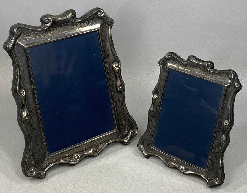 MODERN SILVER-FACED PHOTOGRAPH FRAME, with scroll decoration, 26 x 21cms; and a similar smaller frame, 19 x 16cms