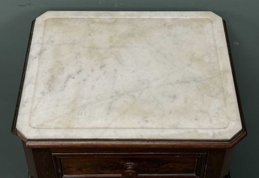 ANTIQUE MAHOGANY POT CUPBOARD, with multiple drawers, drop-down centre, and marble top, 88 (h) x 43 (w) x 38cms (d)