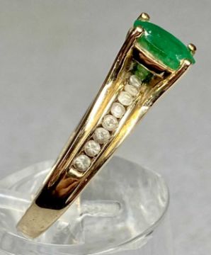 9CT GOLD RING, with centre oval green stone and clear stones to shoulders, size P, 2.8g