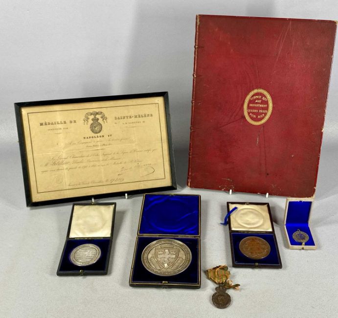 VICTORIAN AWARDS & DECORATIONS, comprising Nottingham School of Art Mayor's Prize Medal, 1881, to Edward Gripper Esq., in fitted presentation case; VR Science and Art Department National Medal for Success in Art to Thomas Dutton, Nottingham 1880, 5.5cms (diam.), in presentation case; Albert Edward Prince of Wales Society of Arts, Manufacturers & Commerce Medal, Thomas Dutton, 1881, in presentation case; Ruhleben League Winners Barracks E. Dutton RFA Medal, 1915, in fitted case; Médaille de Sainte-Hélène Napoleon Medal, with certificate; and Penley, Aaron Sketching from Nature in Watercolours Queen's Prize to Thomas Dutton, Nottingham School of Art