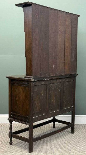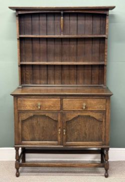 EARLY 20TH CENTURY OAK COMPACT DRESSER, with two shelf rack, the base with two drawers over two cupboard doors, 180 (h) x 111 (w) x 42cms (d)