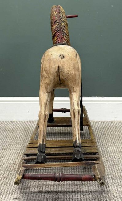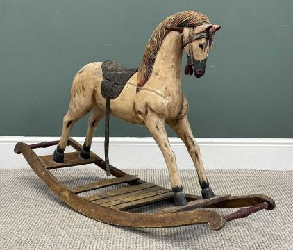 VICTORIAN PAINTED & CARVED WOODEN ROCKING HORSE, on an eliptical base, 76 (h) x 123 (w) x 40cms (d)