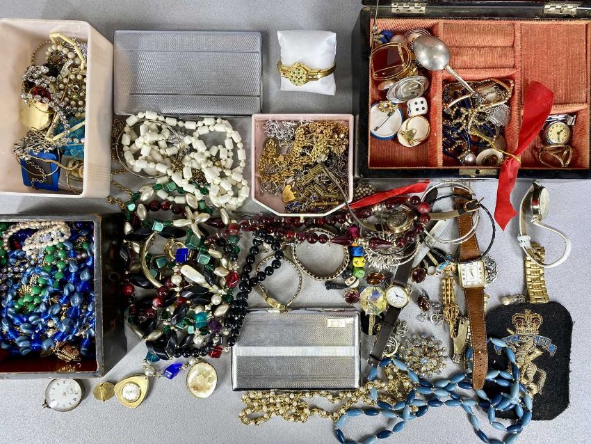 ASSORTED COSTUME JEWELLERY, COINS & WRISTWATCHES