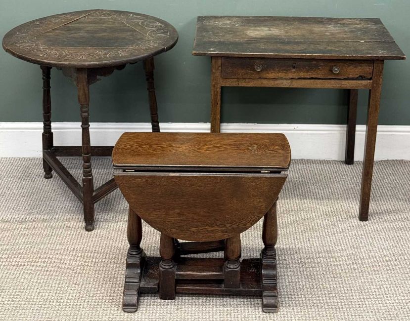 ANTIQUE & LATER OAK FURNITURE comprising lowboy with rectangular plank top over frieze drawer, square supports, 66 (h) x 75 (w) x 53cms (d); a cricket type table having circular carved top with three drop leaves, on three turned supports united by plain stretchers, 67 (h) x 64cms (diam.); and a small oak gateleg table having oval top, 47 (h) x 30/75 with leaves up x 55cms (d)