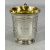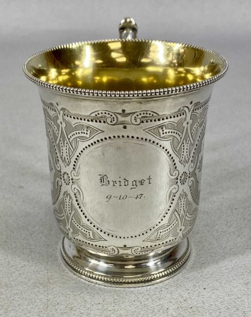 VICTORIAN SILVER CHRISTENING MUG, bead rim, floral and scroll engraved decoration, ornate loop handle, gilt interior, London 1861, 9cms (h), 5.5ozt