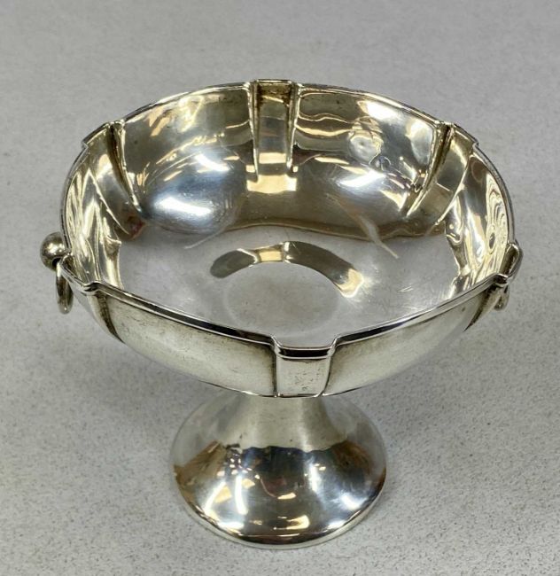 EDWARDIAN CIRCULAR PEDESTAL BOWL, ring side handles, on spreading circular foot, London 1906, 10cms (h), 3.5ozt