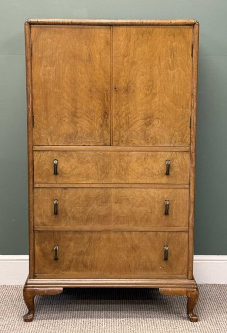 QUEEN ANNE STYLE WALNUT TALLBOY, twin cupboard doors over three drawers, 138 (h) x 82 (w) x 49cms (d)