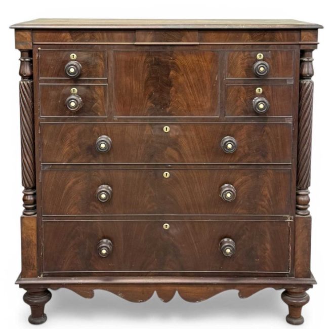 VICTORIAN MAHOGANY CHEST OF DRAWERS, having four small upper drawers and a secret drawer above three long drawers, turned columns and knobs, 129 (h) x 126 (w) x 54cms (d)