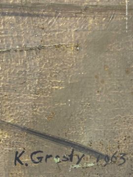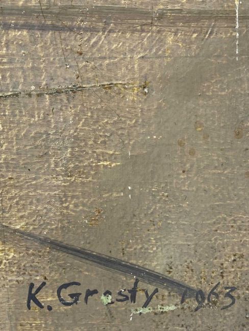 KENNETH HAROLD GRESTY (British, 1928-2002) three works - oil on board, entitled verso 'Cheshire Landscape', signed and dated 1967 lower right, 56 x 77cms; oil on canvas, Cubist-style beach view with figures, signed and dated 1963 lower right, 62 x 92cms; and oil on board, flamingos, signed and dated 1968 lower right, 50 x 70cms (3)