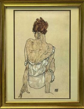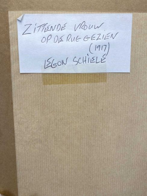 EGON SCHIELE (Austrian, 1890-1918) colour print - portrait from behind of a seated lady, entitled verso 'Zittende Vrouw Op De Rug Gezien (1917)', 46.5 x 29cms