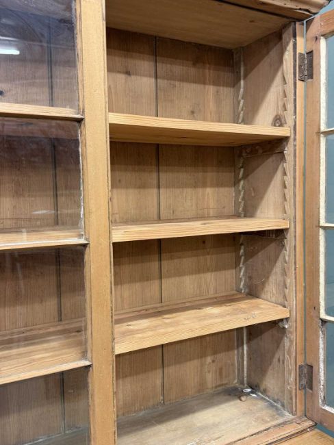 VINTAGE PINE CWPWRDD GWYDR, upper section having twin glazed doors enclosing adjustable shelf-lined interior, case having two panel doors with knob handle, single fixed shelf internally, 200 (h) x 106 (w) x 50cms (d)