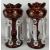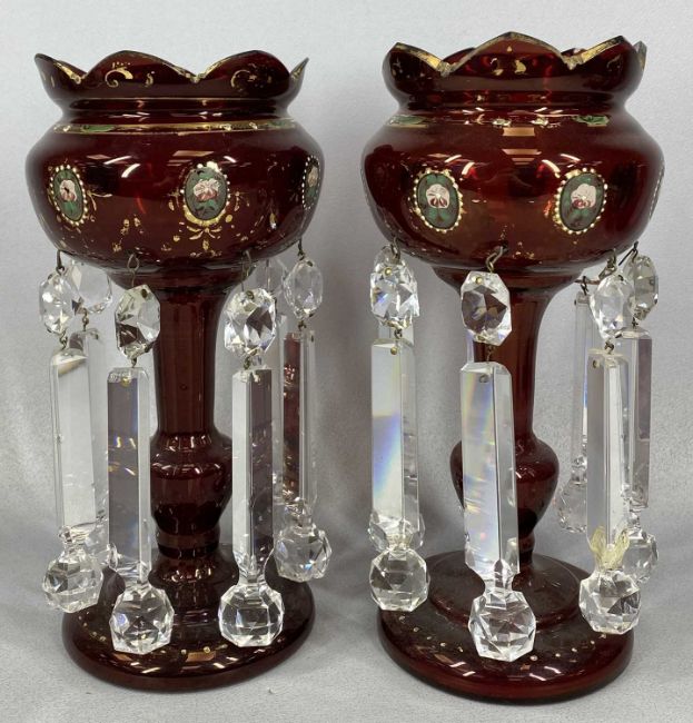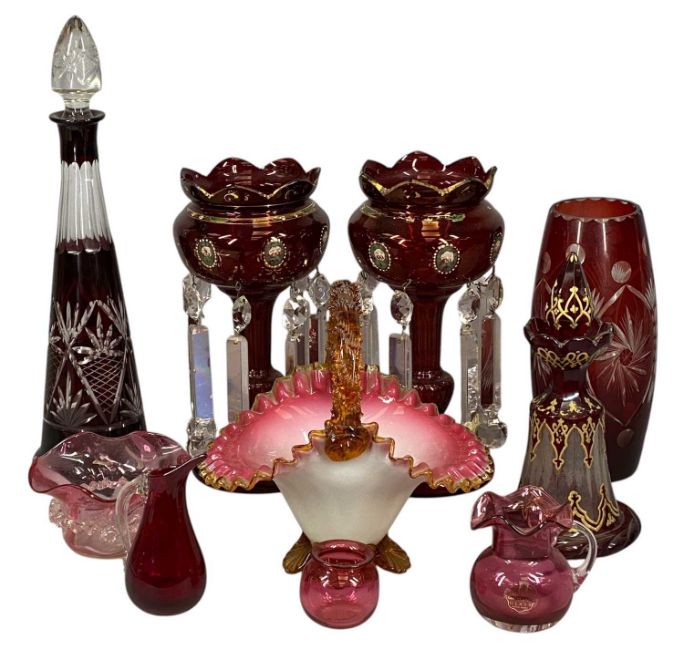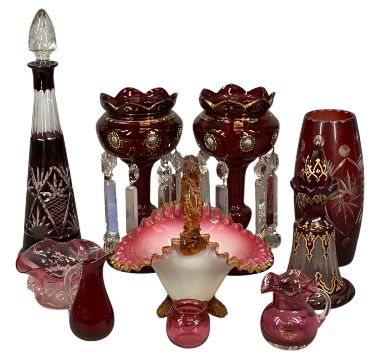 COLOURED GLASSWARE, 19th century and later, including a pair of ruby glass lustres, gilded and painted floral decoration and with clear glass drops, 28cms (h); Bohemian ruby red overlaid cut glass decanter and stopper, 42cms (h); Stevens & Williams type art glass basket, with amber glass 'thorn' handle, etc.