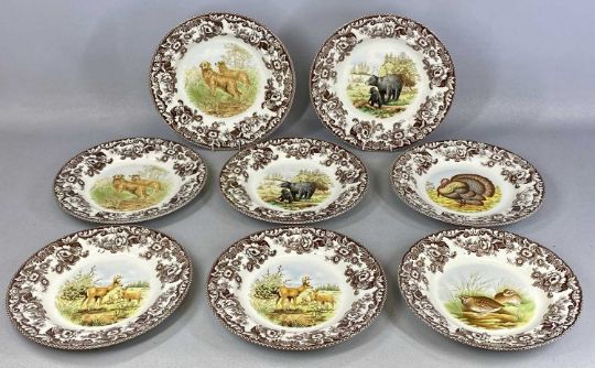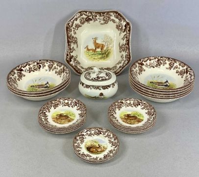SPODE WOODLAND PATTERN DINNER & TEA SERVICE, including large circular serving plate and two-handled circular lidded tureen, 42 pieces