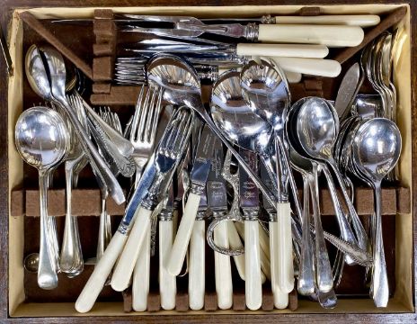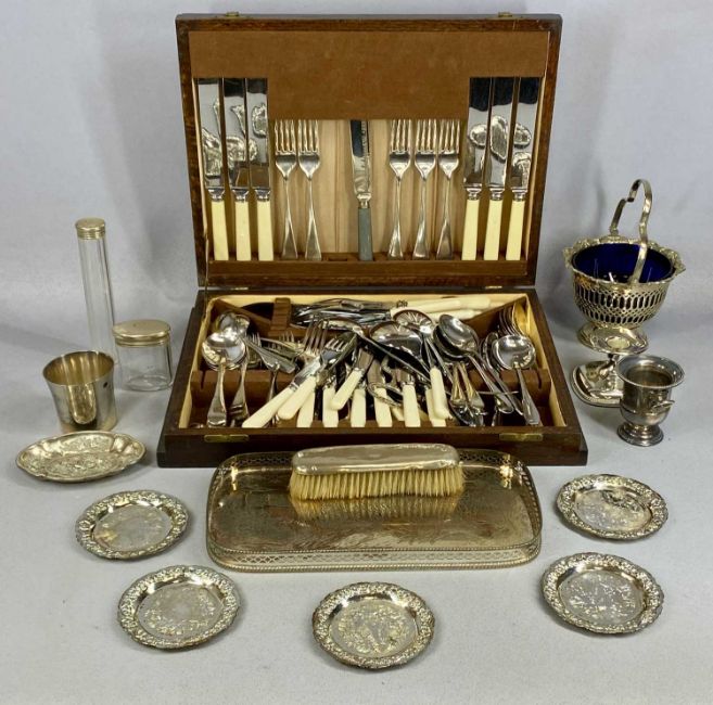 VARIOUS PLATED ITEMS, including oak-cased canteen of cutlery, two glass dressing table jars with silver covers, etc.