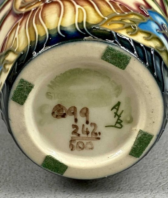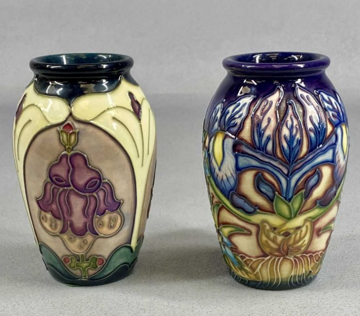 TWO MOORCROFT VASES, Geneva pattern and Foxglove pattern, 10.5cms (h), boxed