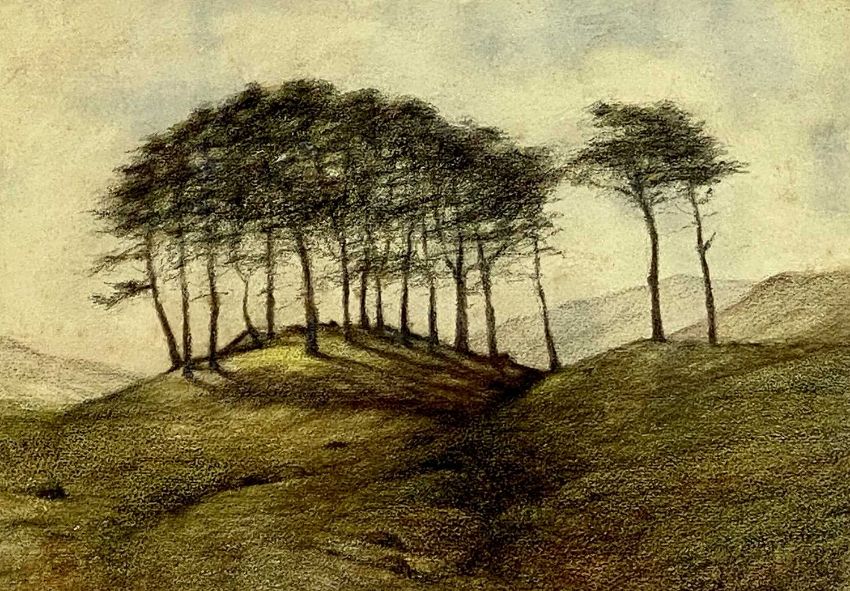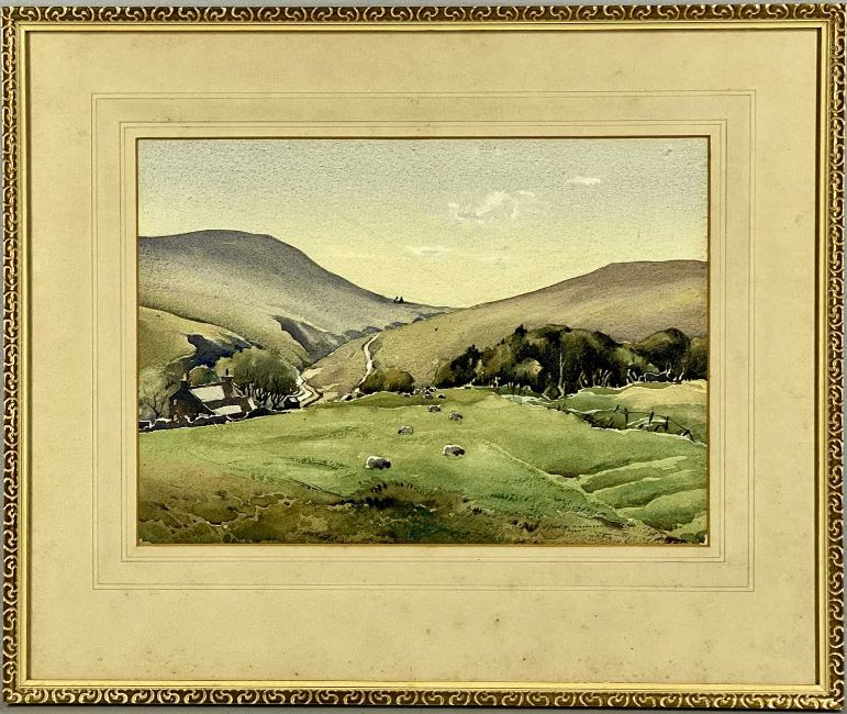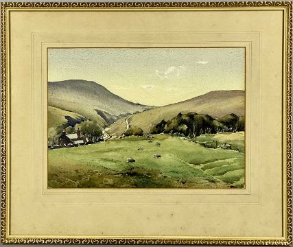 JOHN NICHOLSON watercolour - mountainous view with sheep, signed and dated 1946 lower right, 27 x 38cms; and pastel sketch - clump of trees, unsigned, 24.5 x 35cms (2)