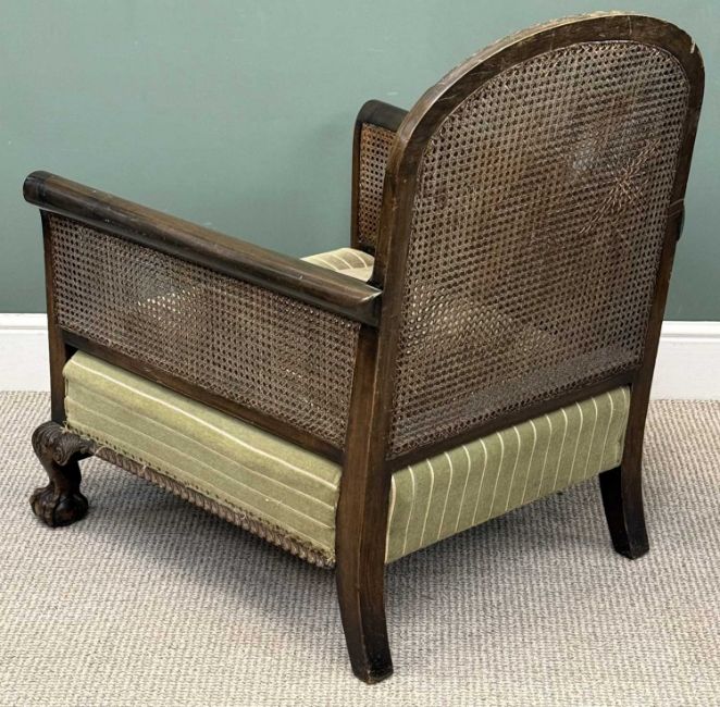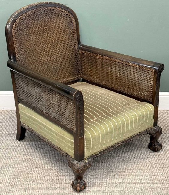 MAHOGANY FRAMED BERGÈRE ARMCHAIR, caned back and armrests, on carved claw and ball frontal supports, 93 (h) x 77 (w) x 72cms (d)