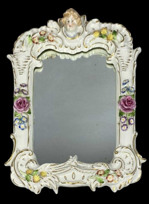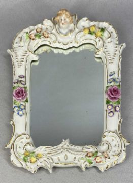 CONTINENTAL PORCELAIN FRAMED MIRROR, mid-20th century, with cherub head surmount and floral encrusted and gilded decoration, 23 x 25cms