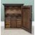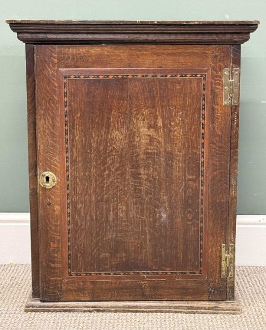UNUSUAL ANTIQUE INLAID OAK WALL CUPBOARD, having fine fitted interior with multiple drawers, 74 (h) x 61 (w) x 26cms (d)
