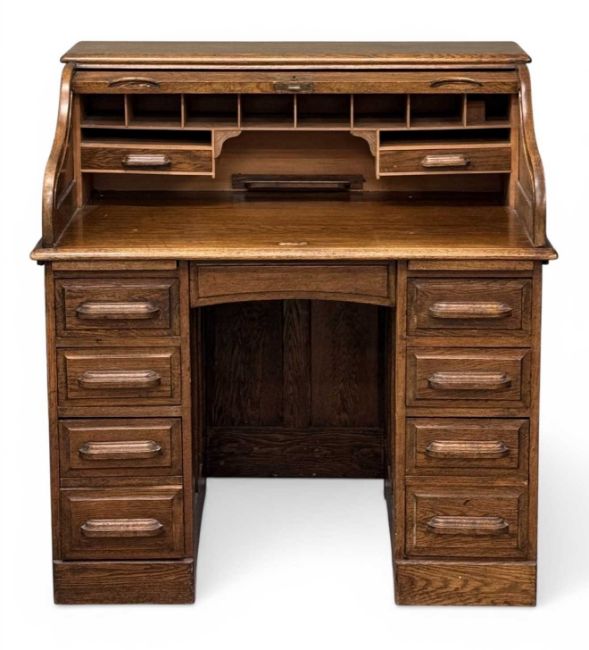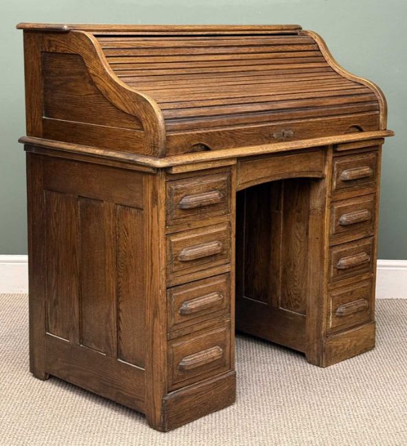 EDWARDIAN OAK ROLL TOP DESK by The Feige Desk Company, 111 (h) x 107 (w) x 66cms (d)