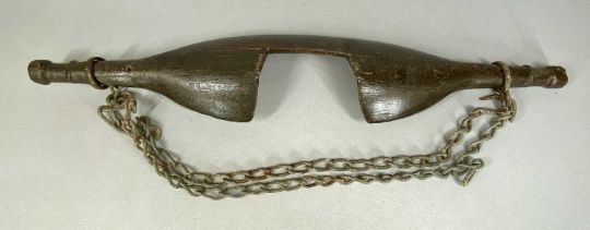 VINTAGE LISTER TABLETOP BUTTER MAKER, with crank handle, 44cms (h); and a vintage elm milk maid's yoke with chains, 88cms (l)