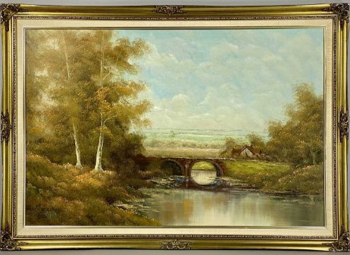 MODERN EUROPEAN / BRITISH SCHOOL oil on canvas - river bridge with cottage to side, indistinctly signed lower left, 60 x 90cms